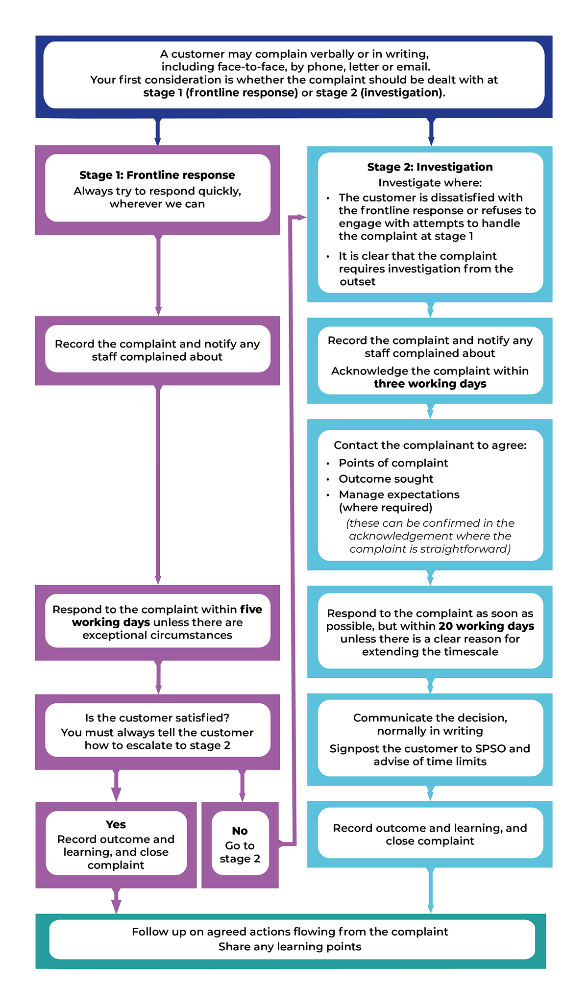 Our complaints procedure has two stages. We expect the majority of complaints will be handled at stage 1. If the customer remains dissatisfied after stage 1, they can request that we look at it again at stage 2. If the complaint is complex enough to require an investigation, we move to stage 2 straight away and skip stage 1.